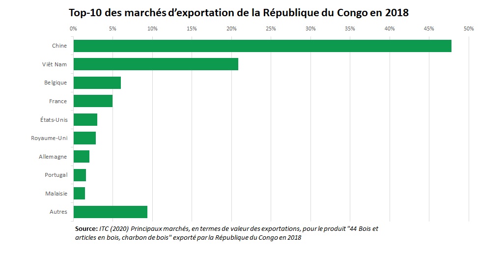 D’après le MEF, la production forestière totale en 2018 était de l’ordre de 1,8 millions de m3 dont 44% (0,8 m3) était exportée sous forme de grumes. Plus de 80% de produits ont été exportés en Asie, 16 % en Europe et moins de 1% en Afrique.Le reste de la production de bois du Congo est exporté sous forme de bois scié.
